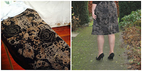 When I saw the line drawings of an A-line skirt in the Knipmode December issue I remembered an end of the bolt piece of fabric that was waiting for the right pattern to come along. It's a mix of velvet and shiny jacquard roses and it was a dream to sew.